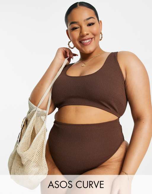 ASOS DESIGN Curve – Mix and Match – Bikinihose in Schokoladenbraun in Knitteroptik mit hohem Beinausschnitt und hohem Bund