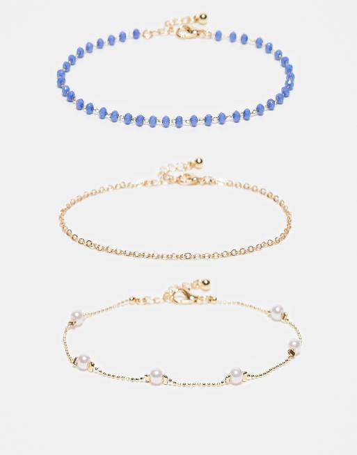 ASOS DESIGN Curve – Multipack Fußkettchen in Gold-Optik mit verschiedenen Designs mit blauen Schmucksteinen und Zierperlen