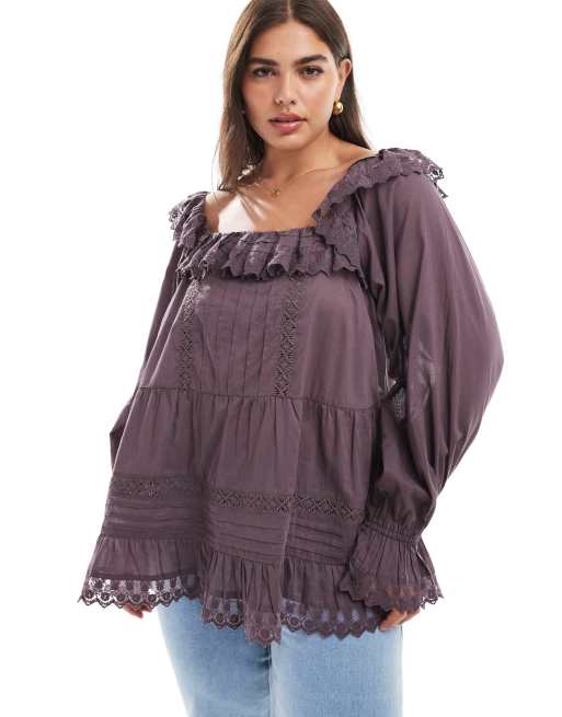 ASOS DESIGN Curve – Oberteil in Pflaumenlila mit Spitze und Lochstickerei-Stoff und eckigem Ausschnitt