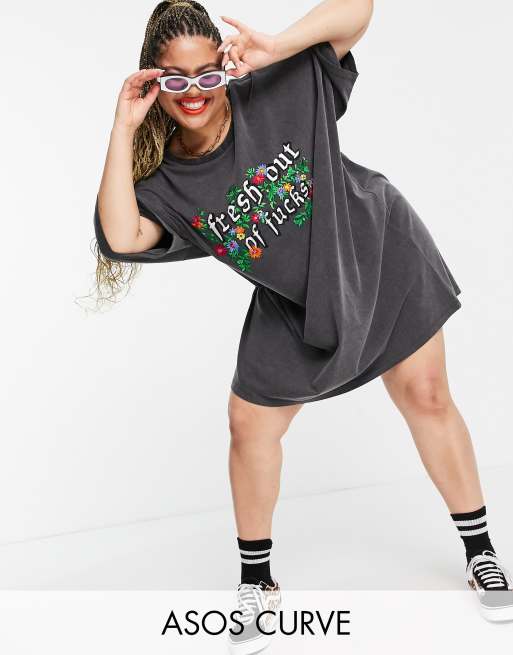 ASOS DESIGN Curve – Oversize-T-Shirt-Kleid in grauer Acid-Waschung mit „Fresh Out Of F--ks“-Sloganprint