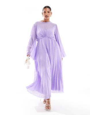 ASOS DESIGN Curve – Plissiertes, hinten gebundenes Chiffon-Midikleid in Flieder mit Trompetenärmeln und Winkelstreifenmuster