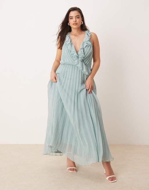 ASOS DESIGN Curve – Plissiertes Midikleid in Salbeigrün mit Rüschen-Wickeldesign