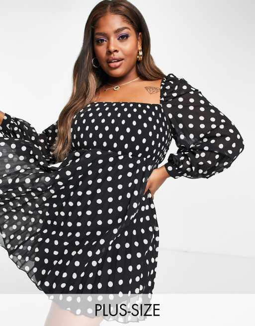 ASOS DESIGN Curve – Plissiertes Mini-Skater-Kleid in Schwarz-Weiß mit eckigem Ausschnitt und Punktemuster