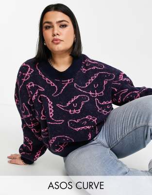 ASOS DESIGN Curve – Pullover in Marineblau mit Dinosauriermuster
