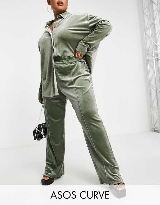 ASOS DESIGN Curve – Pyjamahose aus Samt im Trainingshosen-Design in Khaki