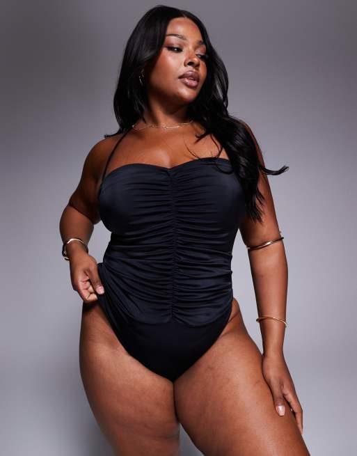 ASOS DESIGN Curve – Revenge – Neckholder-Badeanzug in Schwarz mit Raffung