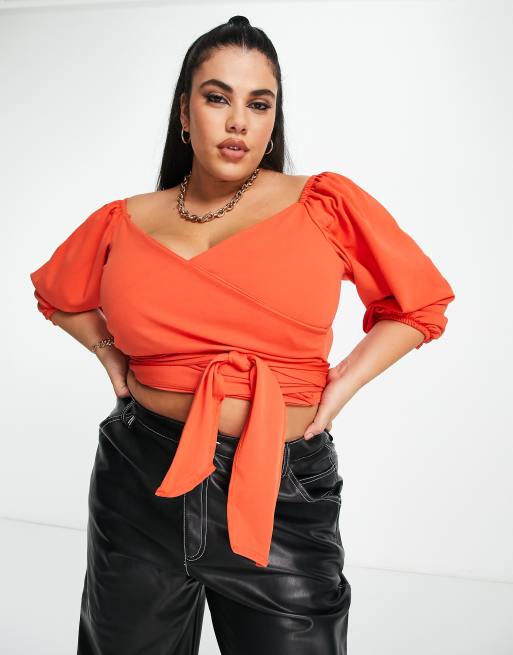 ASOS DESIGN Curve – Schulterfreie, gebundene Wickelbluse in Rot mit Bindeband und voluminösen Ärmeln