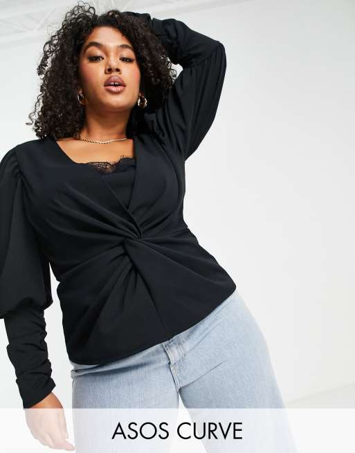 ASOS DESIGN Curve – Stretchbluse mit weiten Ärmeln und Spitzendetail in Schwarz