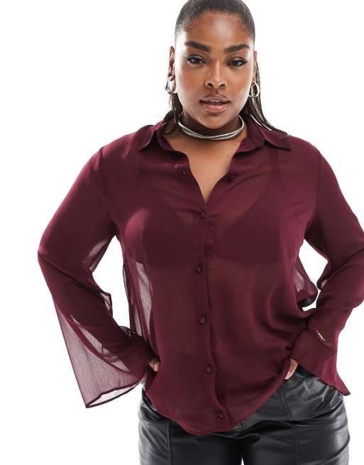 ASOS DESIGN Curve – Transparentes Hemd in Burgunderrot mit Knitterstruktur