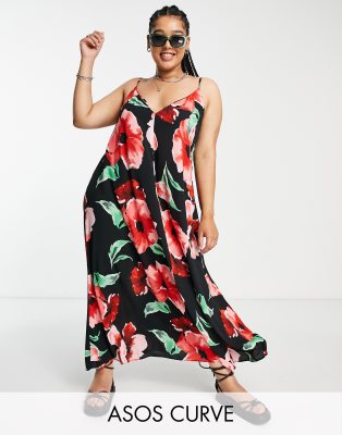 ASOS DESIGN Curve – Trapezförmiges Maxi-Trägerkleid mit großem Blumenmuster