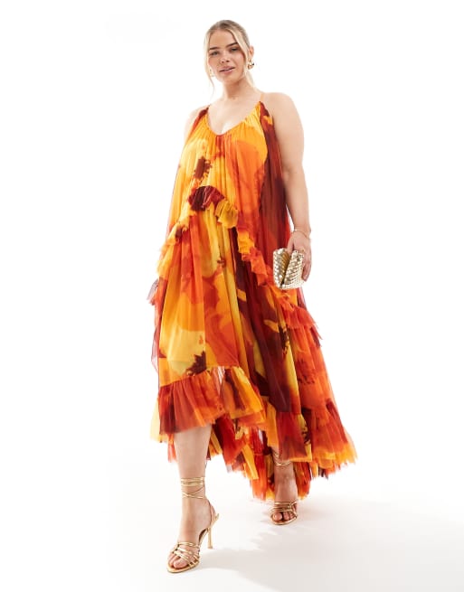 ASOS DESIGN Curve – Trapezförmiges Maxikleid mit U-Ausschnitt, Rüschen und plakativem Blumenmuster