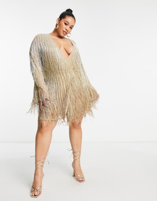 ASOS DESIGN Curve – Verziertes, tief ausgeschnittenes Minikleid in Taupe mit Strassfransen und Farbverlauf