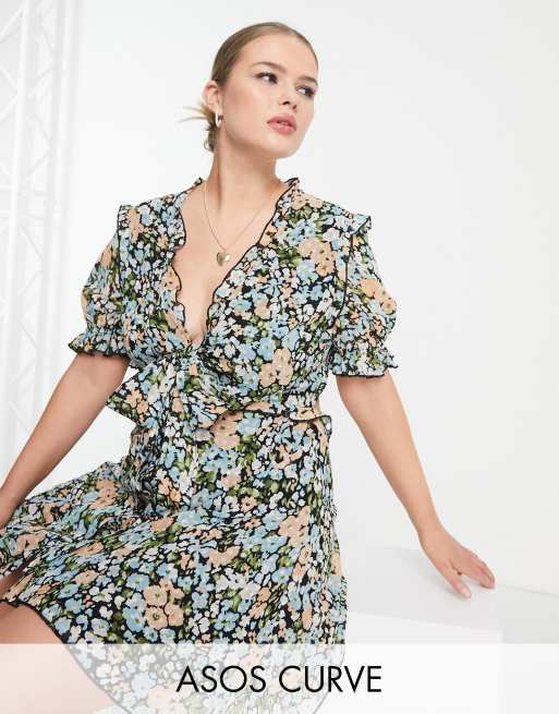 ASOS DESIGN Curve – Vorn gebundenes Minikleid mit Rüschenrock und Blumenmuster