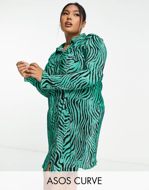 ASOS DESIGN – Langärmliges, plissiertes, kurzes Hemdkleid mit Zebramuster in Grün