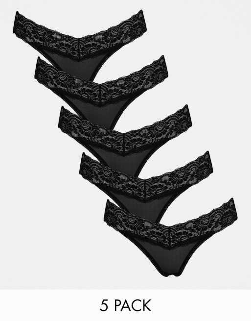ASOS DESIGN – Malibu – 5er-Pack spitzenverzierte Tangas aus Netzstoff mit niedrigem Bund in Schwarz