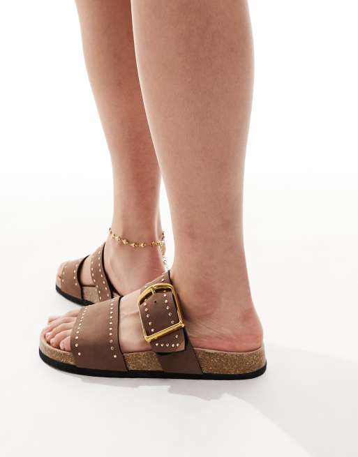 ASOS DESIGN Wide Fit – Fallon – Sandalen in Braun mit Nietenbesatz und Fußbett, weite Passform