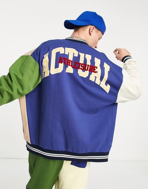 ASOS Actual – Oversize-Bomberjacke mit Logoapplikation und Farbblock-Design in Marineblau