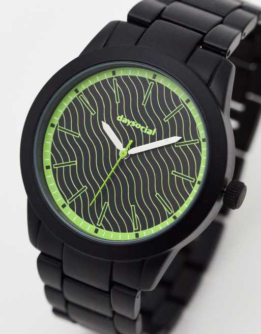 ASOS – Day Social – Armbanduhr in Schwarz mit schwarzem Ziffernblatt und neonfarbenen Akzenten
