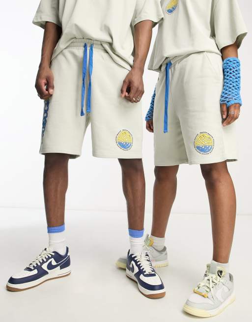 ASOS Daysocial – Locker geschnittene Unisex-Shorts in Blau mit „Exploring“-Grafikprint, Kombiteil