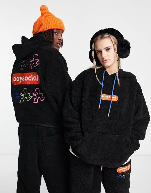ASOS Daysocial – Unisex – Oversize-Kapuzenpullover aus Teddyfell in Schwarz mit Stickerei auf dem Rücken, Kombiteil