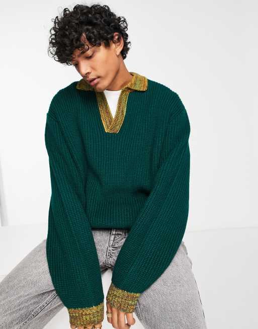 ASOS DEISGN – Oversize-Strickpullover in Grün mit eingekerbtem Ausschnitt und kontrastierendem Besatz