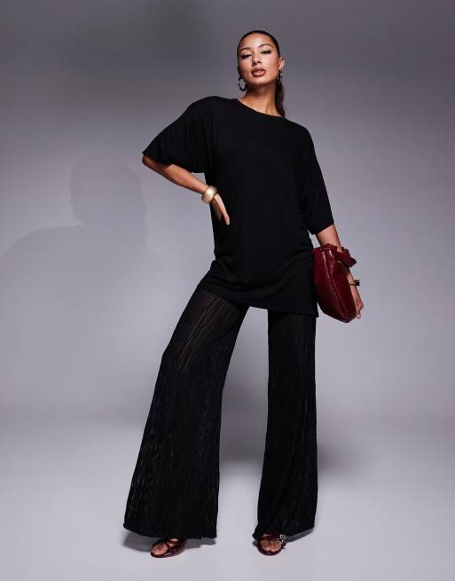 ASOS DESIGN – 2-in-1-Oversize-T-Shirt mit plissierter Hose in Metallic-Optik in Schwarz