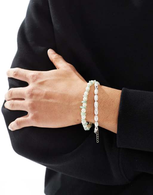 ASOS DESIGN – 2er-Pack Armbänder mit Kunstperlen in Cremeweiß und Splittern in Jadeoptik