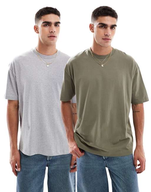 ASOS DESIGN – 2er-Pack Basic-T-Shirts in meliertem Grau und Khaki mit Oversize-Schnitt