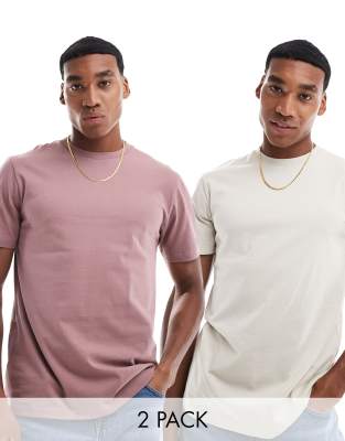 ASOS DESIGN – 2er-Pack Basic-T-Shirts in Steinbeige und Braun mit Rundhalsausschnitt