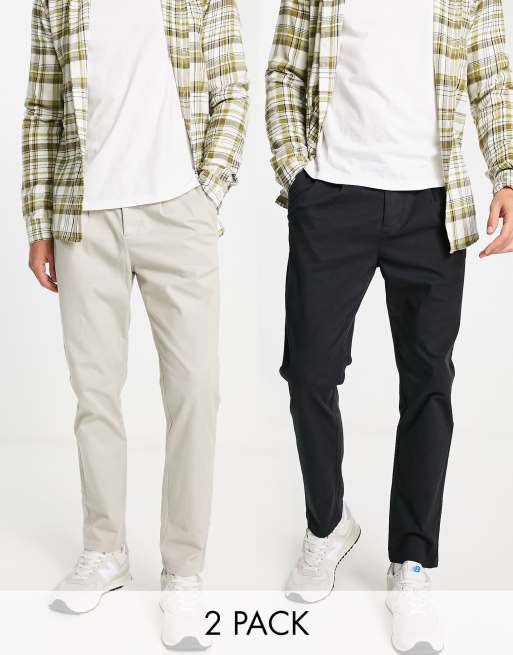 ASOS DESIGN – 2er-Pack Chinohosen in Hellgrau und Schwarz mit Bundfalten