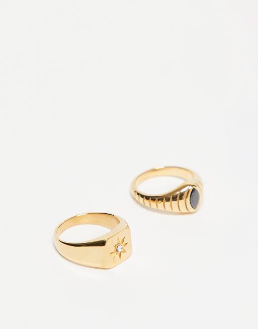 ASOS DESIGN – 2er-Pack goldfarbene Festival-Siegelringe aus wasserfestem Edelstahl mit Kristallstein und schwarzem Schmuckstein