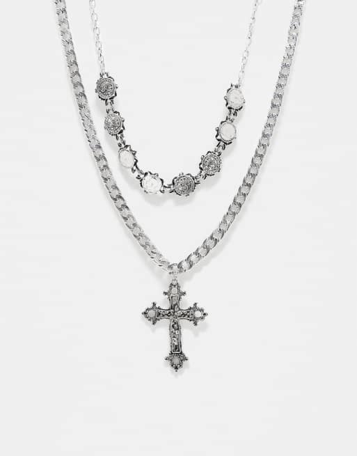 ASOS DESIGN – 2er-Pack Halsketten in brünierter Silberoptik mit Kreuz- und Münzenanhängern