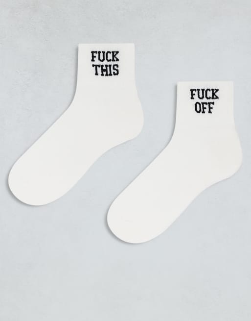 ASOS DESIGN – 2er-Pack Kurzsocken in Ecru mit „Fuck Off“-Schriftzug