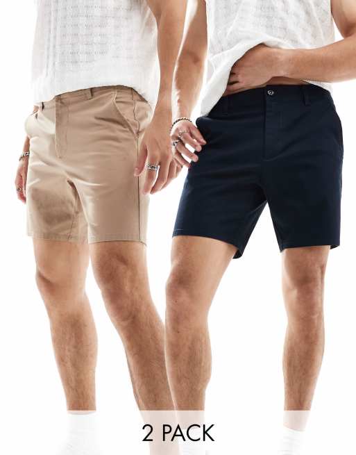 ASOS DESIGN – 2er-Sparpack eng geschnittene Chino-Shorts in Steinbeige und dunklem Marineblau