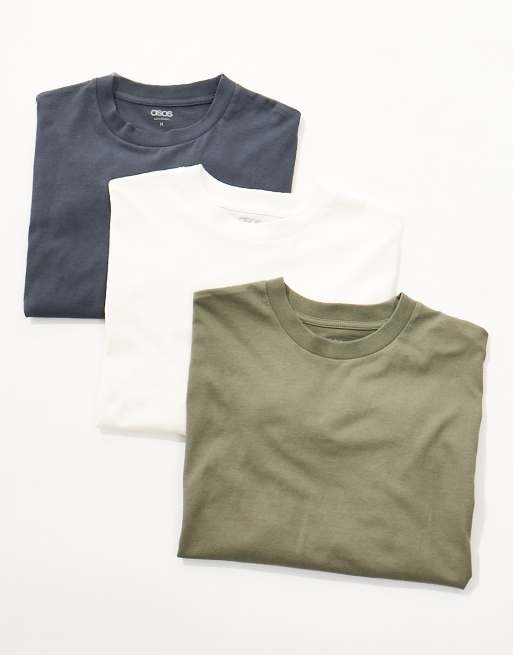 ASOS DESIGN – 3er-Pack Basic-T-Shirts in Cremeweiß, Anthrazit und Khaki mit Rundhalsausschnitt und Oversize-Schnitt