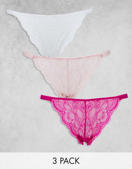 ASOS Design – 3er-Pack brasilianischer Tanga mit elastischem Bund, aus Spitze in Weiß, Kirschrot und Rose