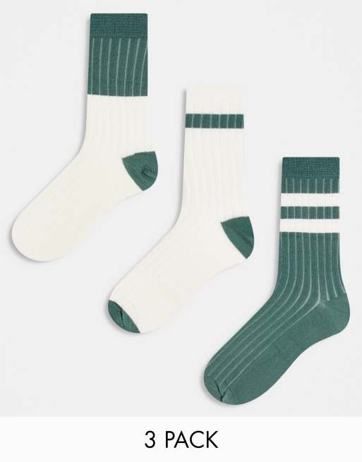 ASOS DESIGN – 3er-Pack gerippte knöchellange Socken mit Streifen in Grün und Ecru