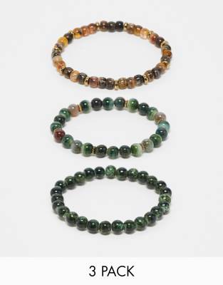 ASOS DESIGN – 3er-Pack Perlenarmbänder mit Halbedelsteinen in Grün und Gold-Optik