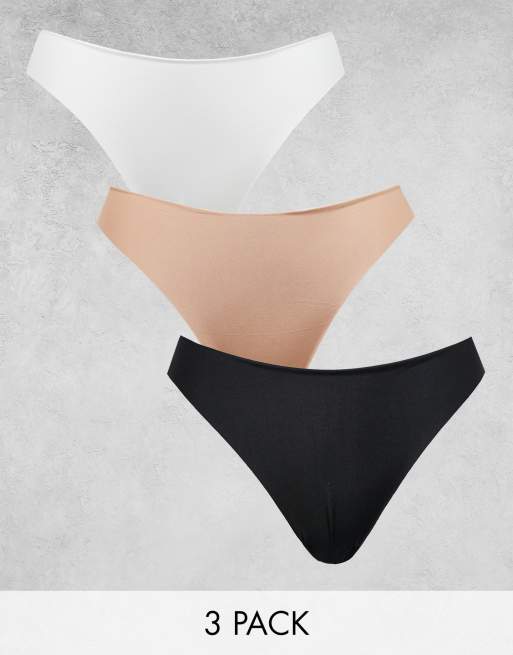 ASOS DESIGN – 3er-Pack sich nicht abzeichnende Spitzen-Tangas in Schwarz, Weiß und Beige