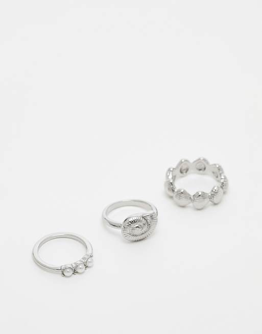ASOS DESIGN – 3er-Pack silberfarbene Ringe mit Kunstperlen- und Muscheldesign