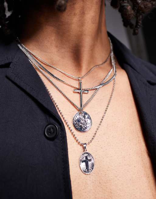ASOS DESIGN – 4er-Pack Halsketten in Silberoptik mit Ketten- und Kreuzanhänger
