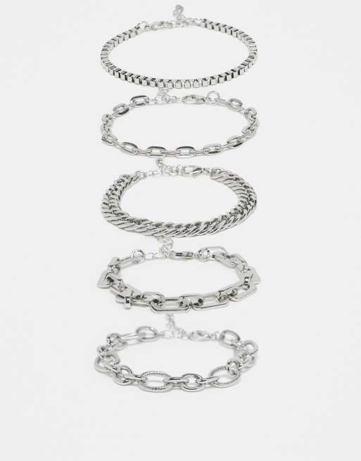 ASOS DESIGN – 5er-Pack mit verschiedenen, silberfarbenen Ketten-Armbändern zum Kombinieren