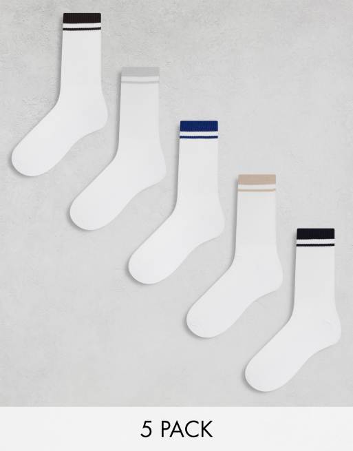 ASOS DESIGN – 5er-Pack Socken in Weiß mit Zierstreifen in verschiedenen Farben