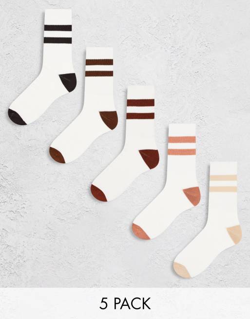 ASOS DESIGN – 5er-Pack Sportsocken in gebrochenem Weiß mit Streifen in neutralen Farbtönen