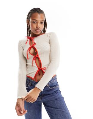 ASOS DESIGN – Angeraute, gerippte, asymmetrische Strickjacke in Creme mit Schleifen