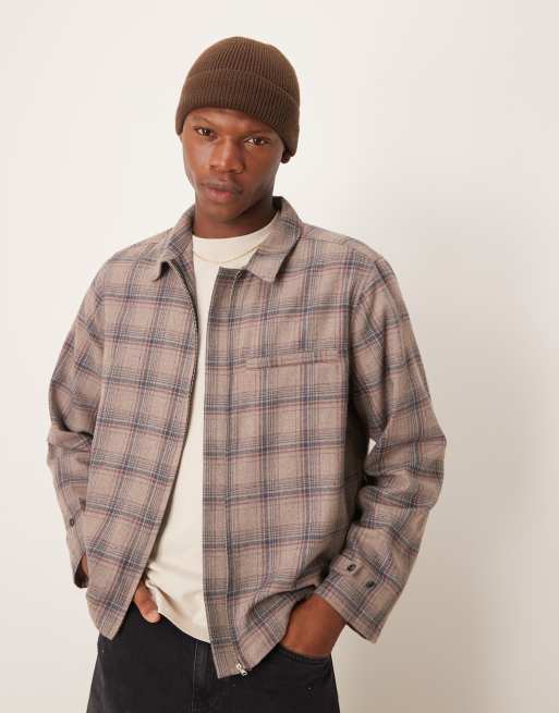 ASOS DESIGN – Angeraute Hemdjacke in Braun kariert mit Reißverschluss und lockerem, kastigem Schnitt