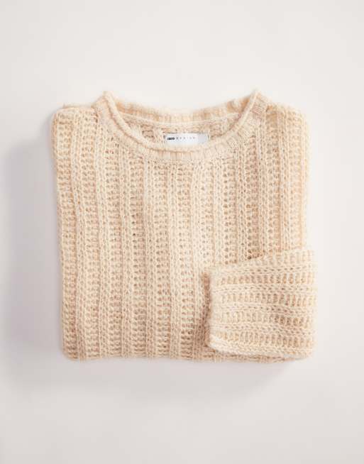 ASOS DESIGN – Angerauter Oversize-Strickpullover aus weitmaschigem Rippstrick in Cremeweiß