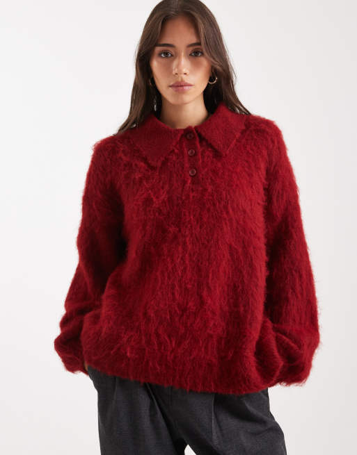 ASOS DESIGN – Angerauter Rugby-Pullover in Rot mit Polokragen