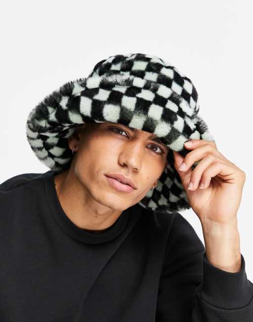 ASOS DESIGN – Anglerhut aus Kunstpelz mit 90er-Schachbrettmuster in Schwarz und Grün, Kombiteil