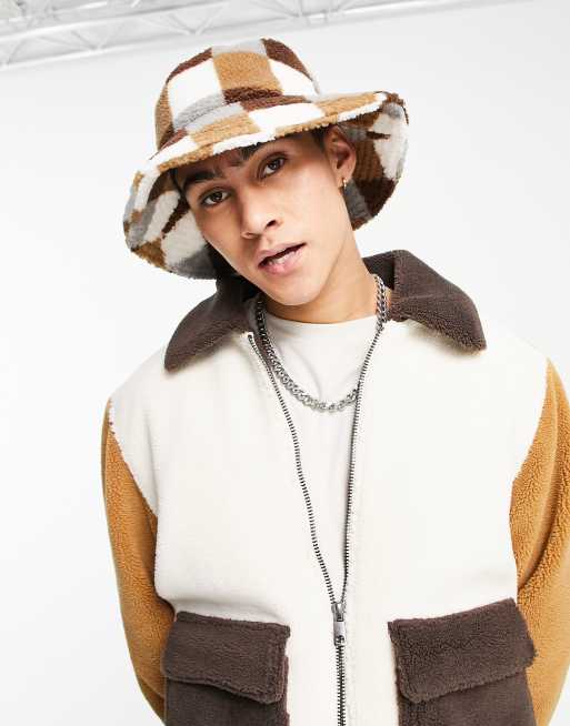 ASOS DESIGN – Anglerhut aus Teddyfell mit Karomuster in Ecru und Braun